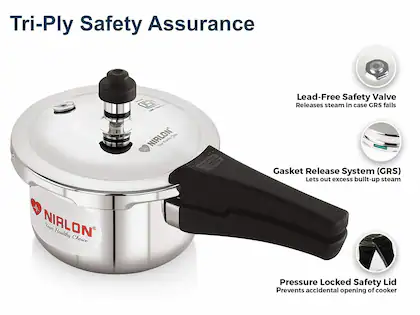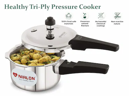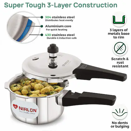 Nirlon brings you dome lid outer lid triply outer lid pressure cooker, the stainless steel layer of tri-ply cookware remains intact and useful even when it gets used and scratched for an extended period. Tri-ply cookware is built to last and can easily last decades if properly cared for. It has a greater melting point; thus it keeps its shape and cooking capabilities long. Cleaning tri-ply cookware is an easy affair. Even a simple solution of warm water and a gentle wipe is enough. Steel wool can also be used to scour the pan. There is no chance of toxic chemicals tainting your food when it comes to using tri-ply stainless steel. It is non-reactive and won’t lead to your food becoming harmful for consumption. Unlike any regular non-stick cookware set, it does not have a Non-Stick coating, but it can still lower the chances of your food getting burnt by sticking to the surface.